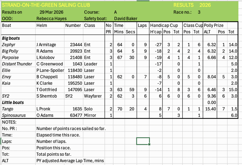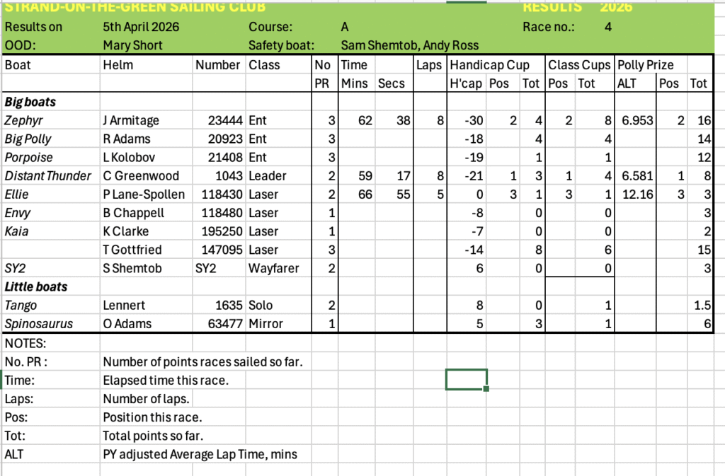 The Enterprises continued their tight formation, while Tamir darted in and out of them, catching gusts at just the right moment. After an hour of lively, gust‑driven racing, the finish was a thriller: Tamir slipped ahead of Zephyr by just one second to cross the finish line, with Big Polly close behind and then Porpoise, all four boats completing 9 laps. Ben completed seven laps in Envy, Sam and crew finished with six laps in SY2, and Lennard completed four determined laps in Tango. Well, done to all who braved the cold to complete an adrenaline filled race.